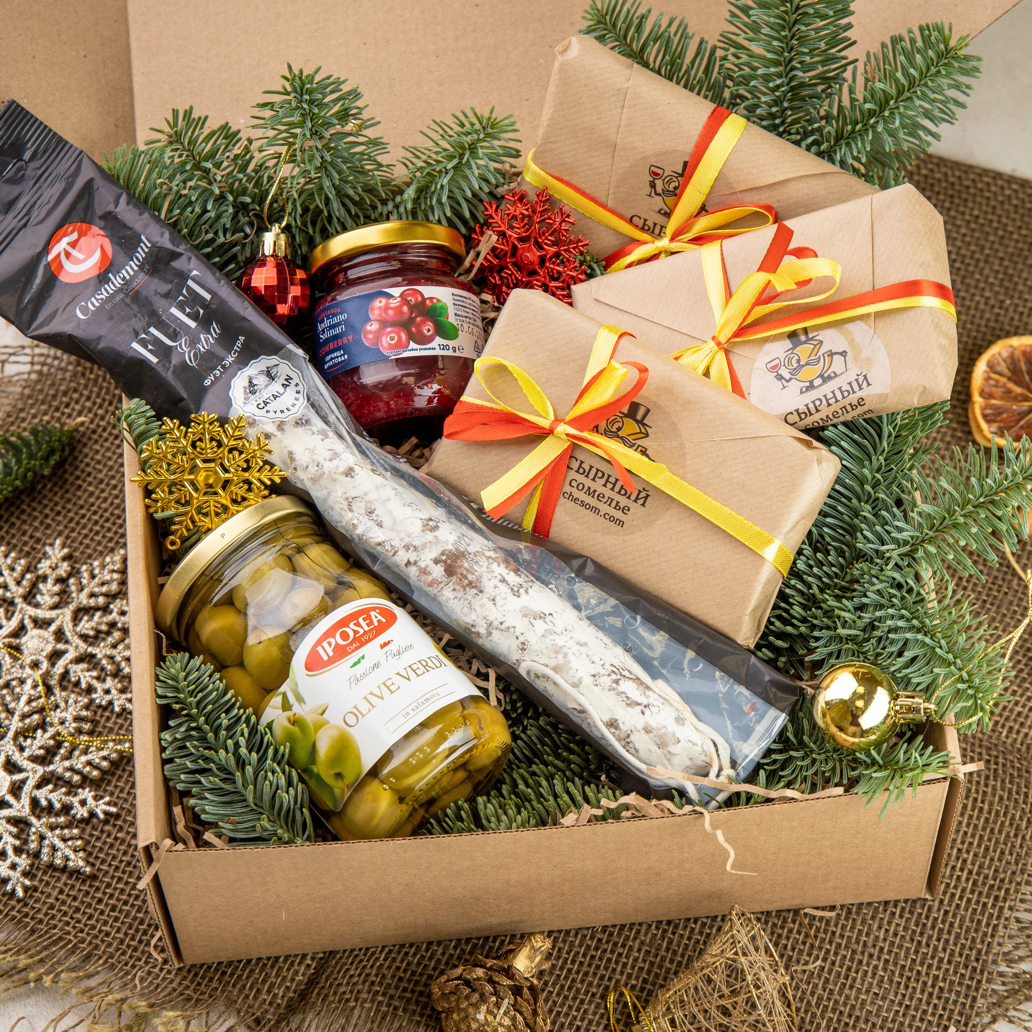Подарочный гастрономический набор, упакованный в крафтовую коробку и новогодние украшения