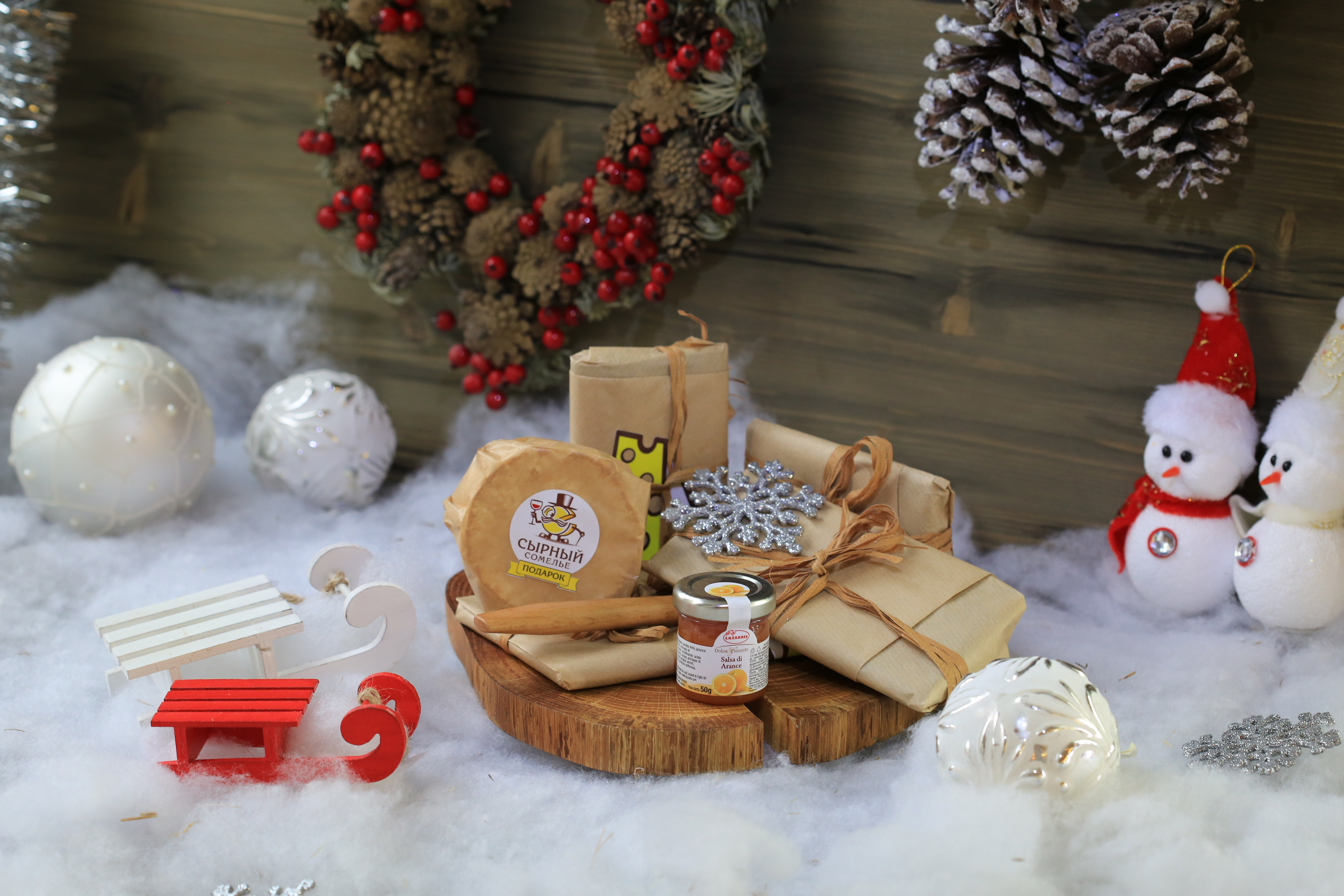 Подарочный набор с тремя видами сыров и фирменным джемом в праздничном оформлении